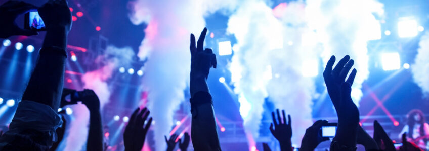 New Year eve celebration, party in nightclub many people standing with raised hands up and clapping, happiness and night life concept.Pročitaj više